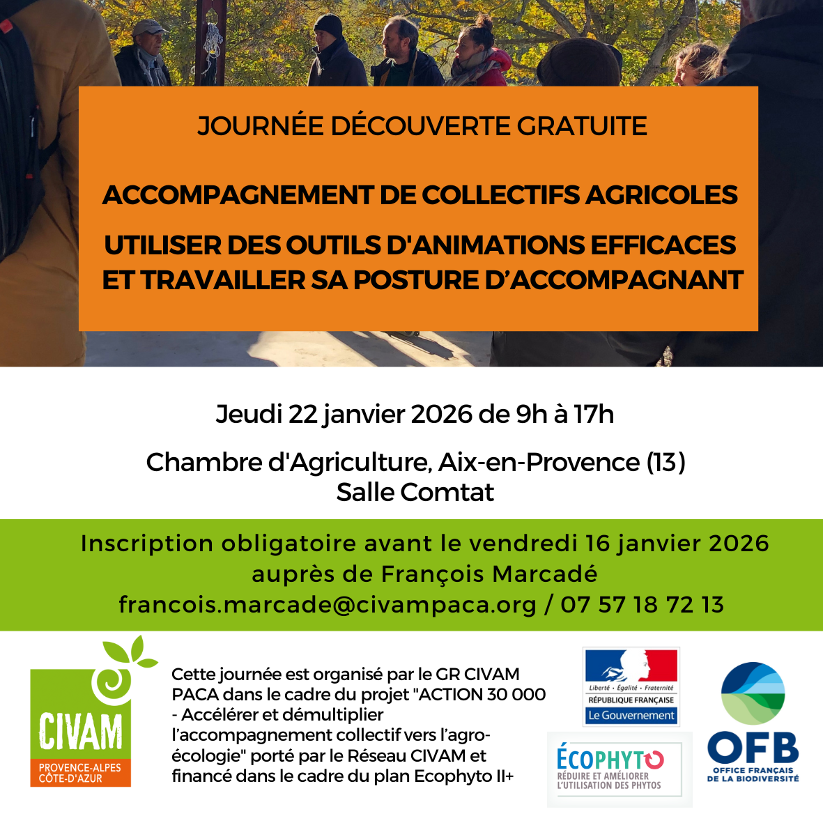 Le GR CIVAM PACA et Trame organise cette journée le jeudi 22 janvier 2026 de 9h à 17h à Aix-en-Provence pour les animateur.trices, conseiller.ères accompagnant des groupes d’agriculteur.trices (GIEE, Dephy, 30 000 et autres).